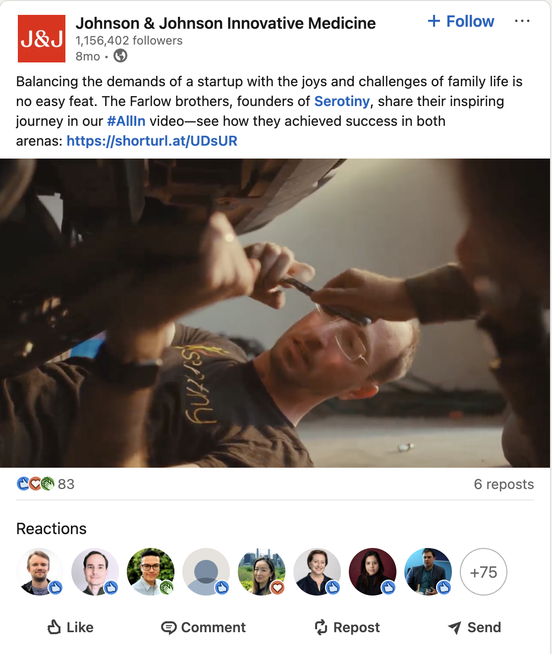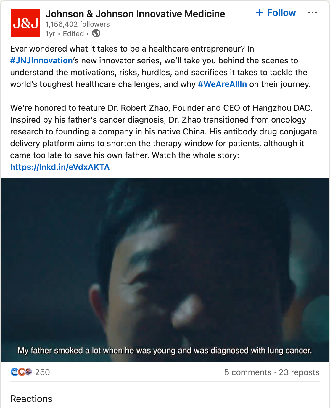 Background: A campaign to tell the stories of innovative healthcare entrepreneurs around the world whose work has been enabled by the collaboration of Johnson & Johnson, centered around documentary films following the entrepreneurs’ journeys in work and life. Deliverables also included organic and paid social cutdowns of the full-length documentaries.